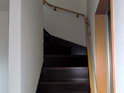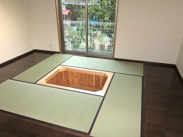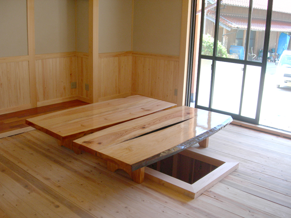 狭く変形した三角の土地に、設計・構造を工夫して家を建てました。 総二階で、家の総面積を確保しています。 ヒノキの無垢で作った掘りごたつ。 階段は、無垢のダークブラウンの集成材。