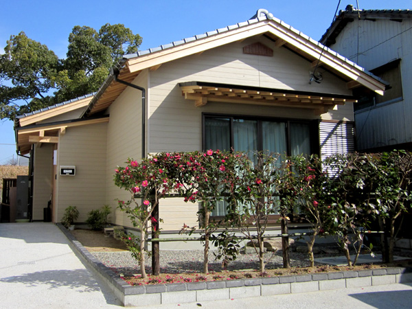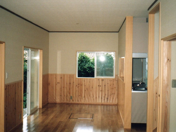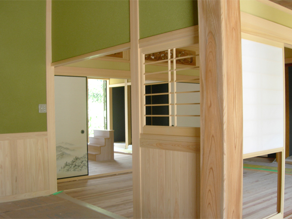 高齢者が住みやすい工夫を施し、設計しました。 玄関の入り口は段差を極力控えています。 和を思わせる天然木を壁や床・天囲・扉などにふんだんに 使用。 和室の障子や柱もすべて無垢材です。
